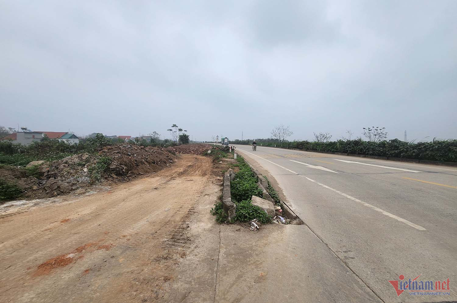 Ghi nhận của VietNamNet vào giữa tuần qua cho thấy, nhiều khu vực trên tuyến đê còn ngổn ngang vật liệu xây dựng, rác thải. Công trình chậm tiến độ gây ảnh hưởng trực tiếp đến cuộc sống của người dân, ngày nắng thì bụi mù, ngày mưa thì lầy lội tiềm ẩn nguy cơ mất an toàn giao thông trong khu vực.