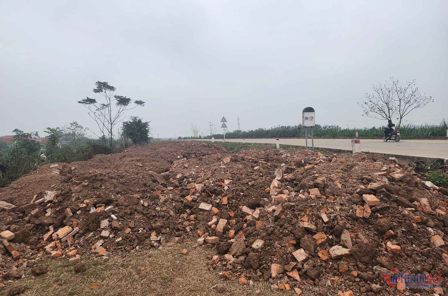 Nguyên vật liệu và rác nằm ngổn ngang trên tuyến đê. Ảnh: Nhị Tiến