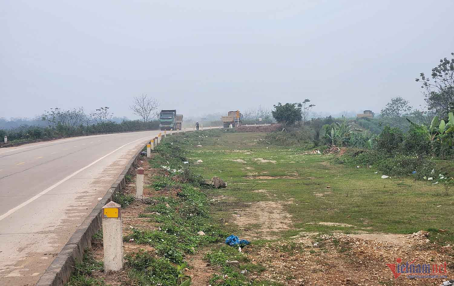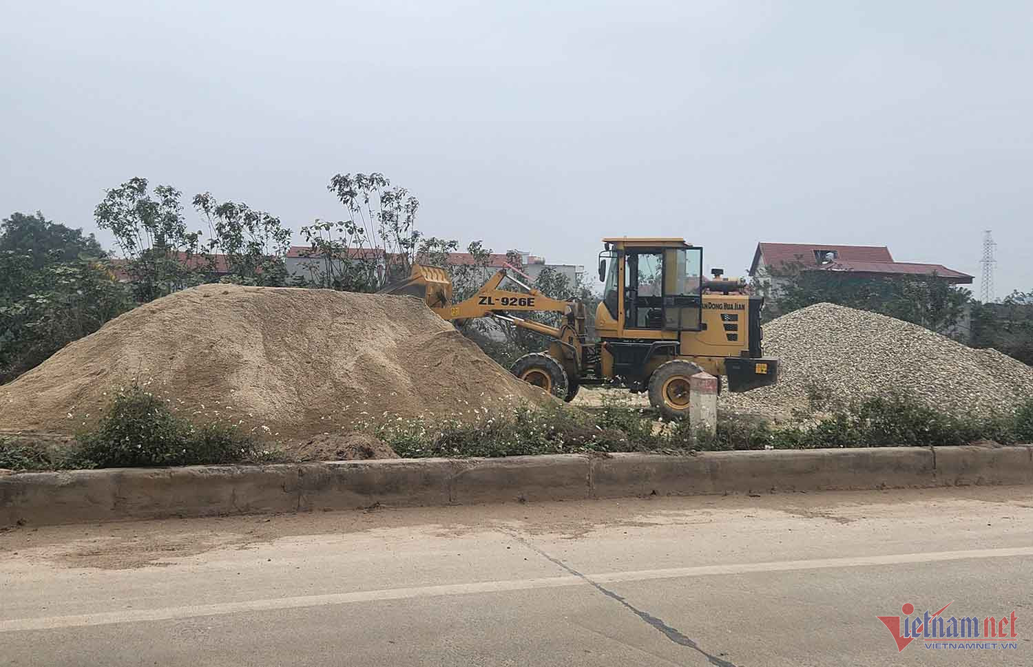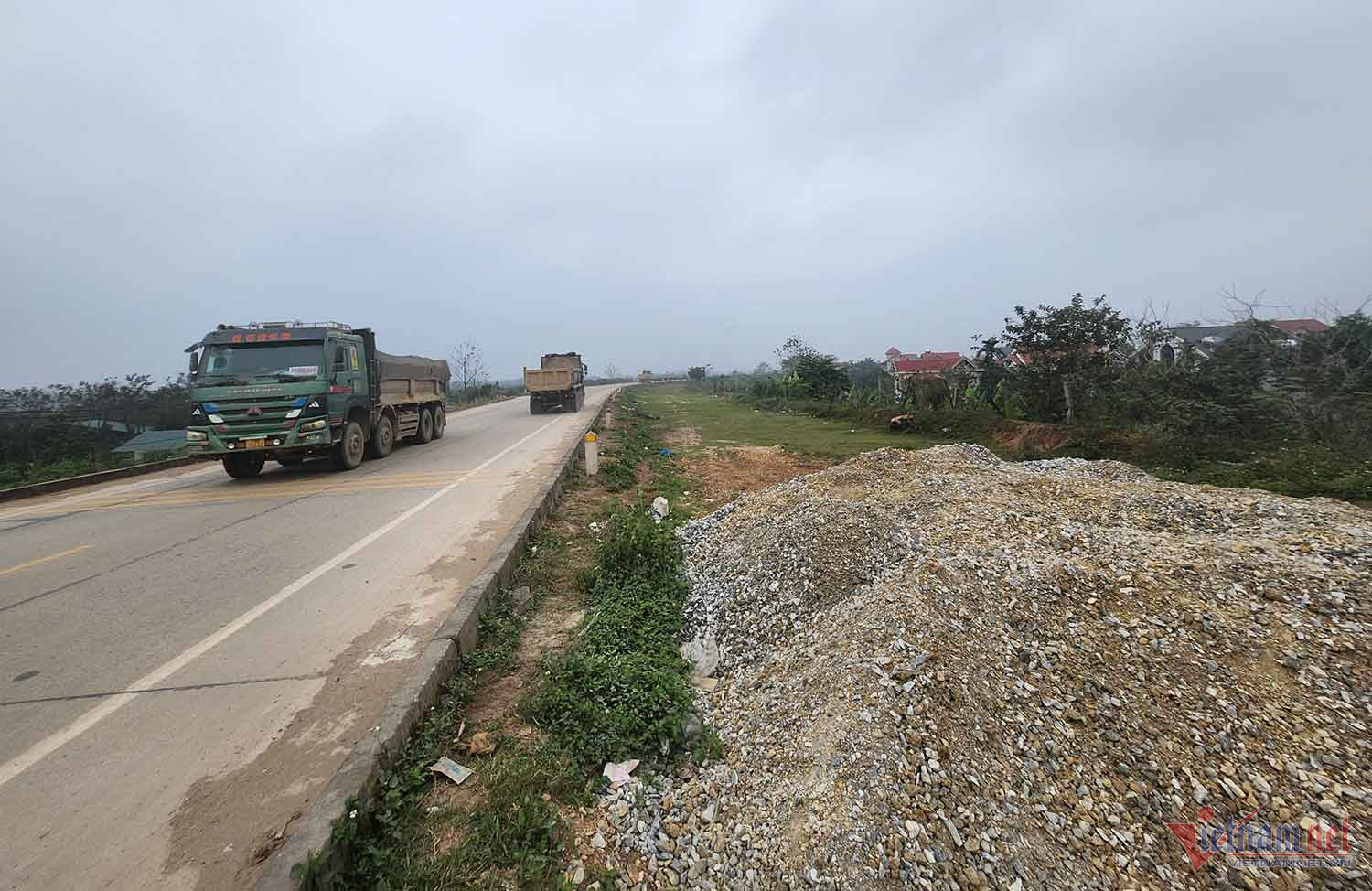 Tuyến đê chậm tiến độ giờ trở thành nơi các phương tiện dừng đỗ và chất hàng. Ảnh: Nhị Tiến